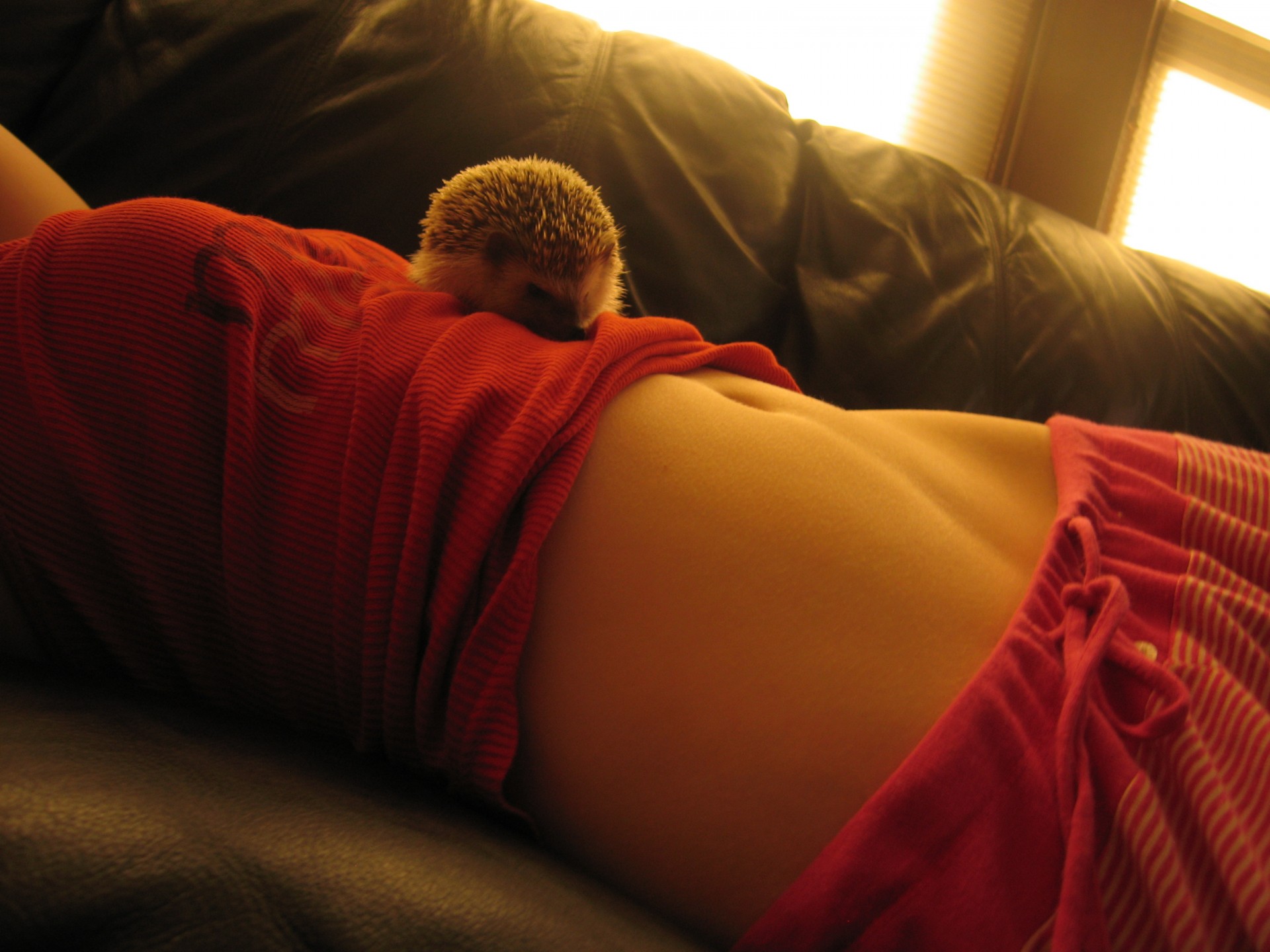 La jeune fille sur le ventre dans un t-shirt rouge est un hérissonLa jeune fille sur le ventre dans un t-shirt rouge est un hérisson