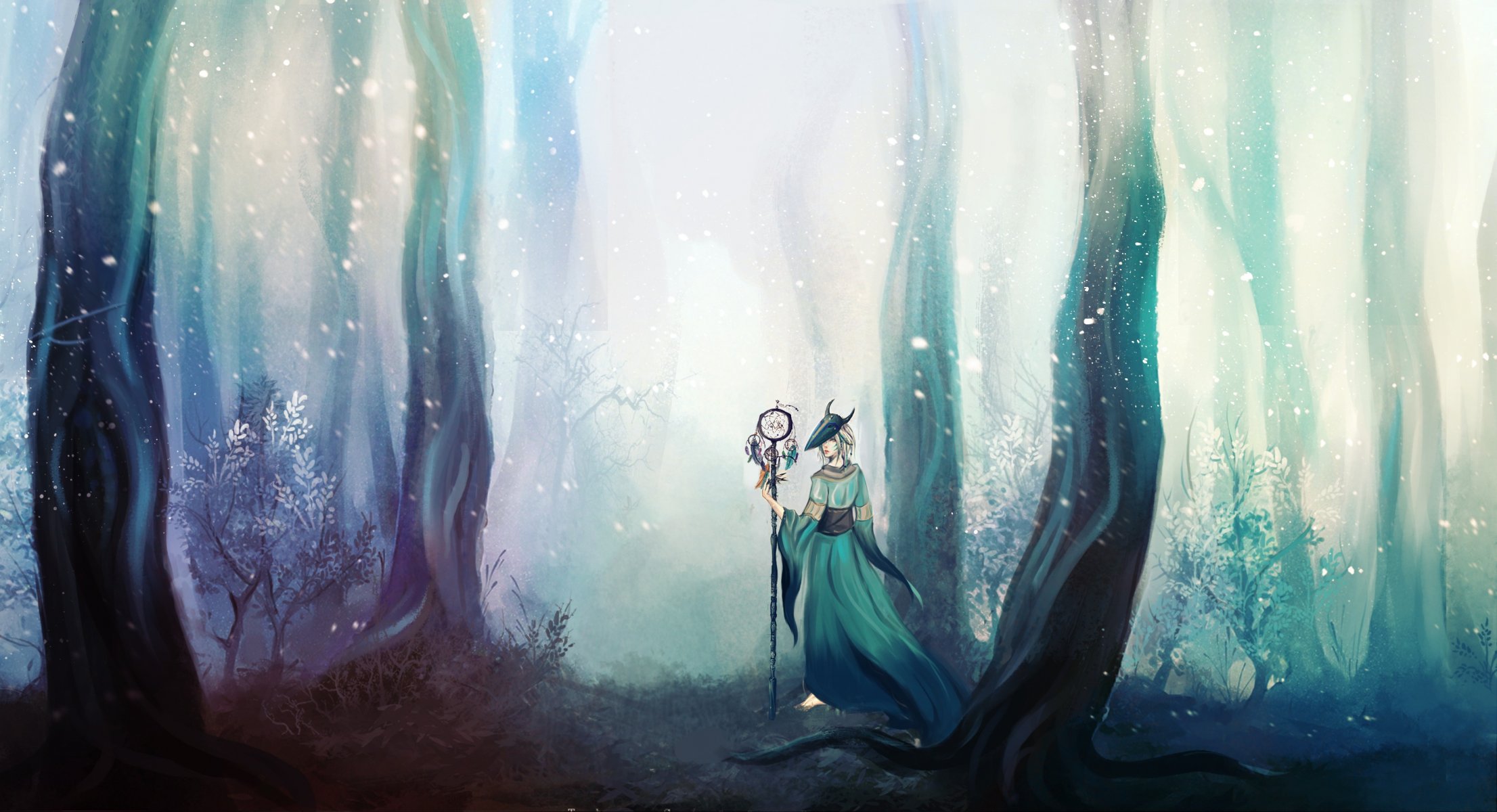 Fille mythique avec un bâton dans la forêt