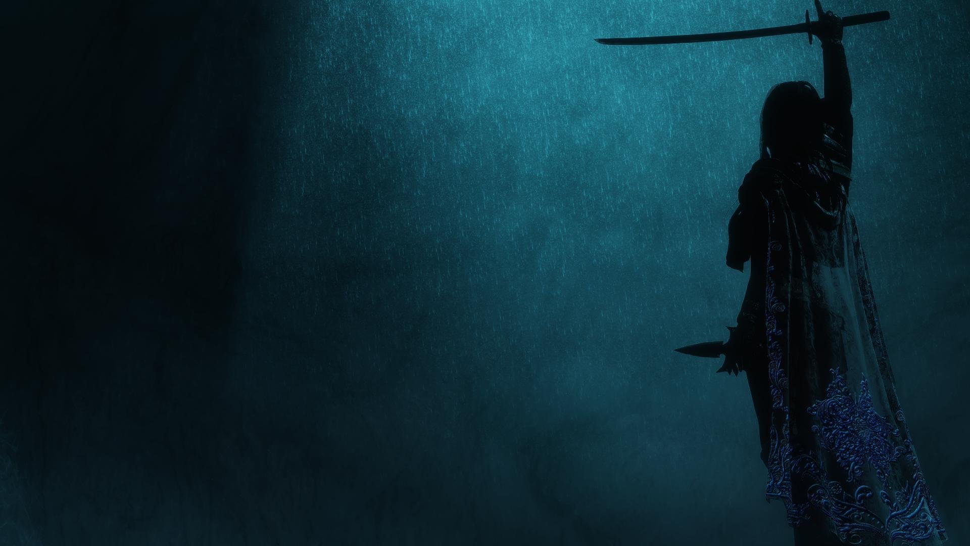 Le rendu de la jeune fille avec une épée sur un fond bleuLe rendu de la jeune fille avec une épée sur un fond bleu