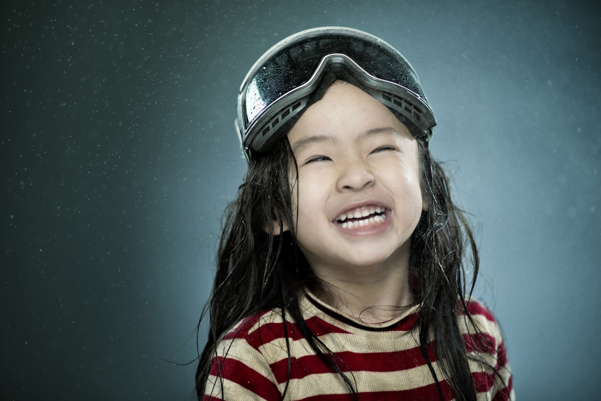 Fille aux yeux bleus couvre son visage avec ses mains dans des mitaines blanches chaudesFille aux yeux bleus couvre son visage avec ses mains dans des mitaines blanches chaudes