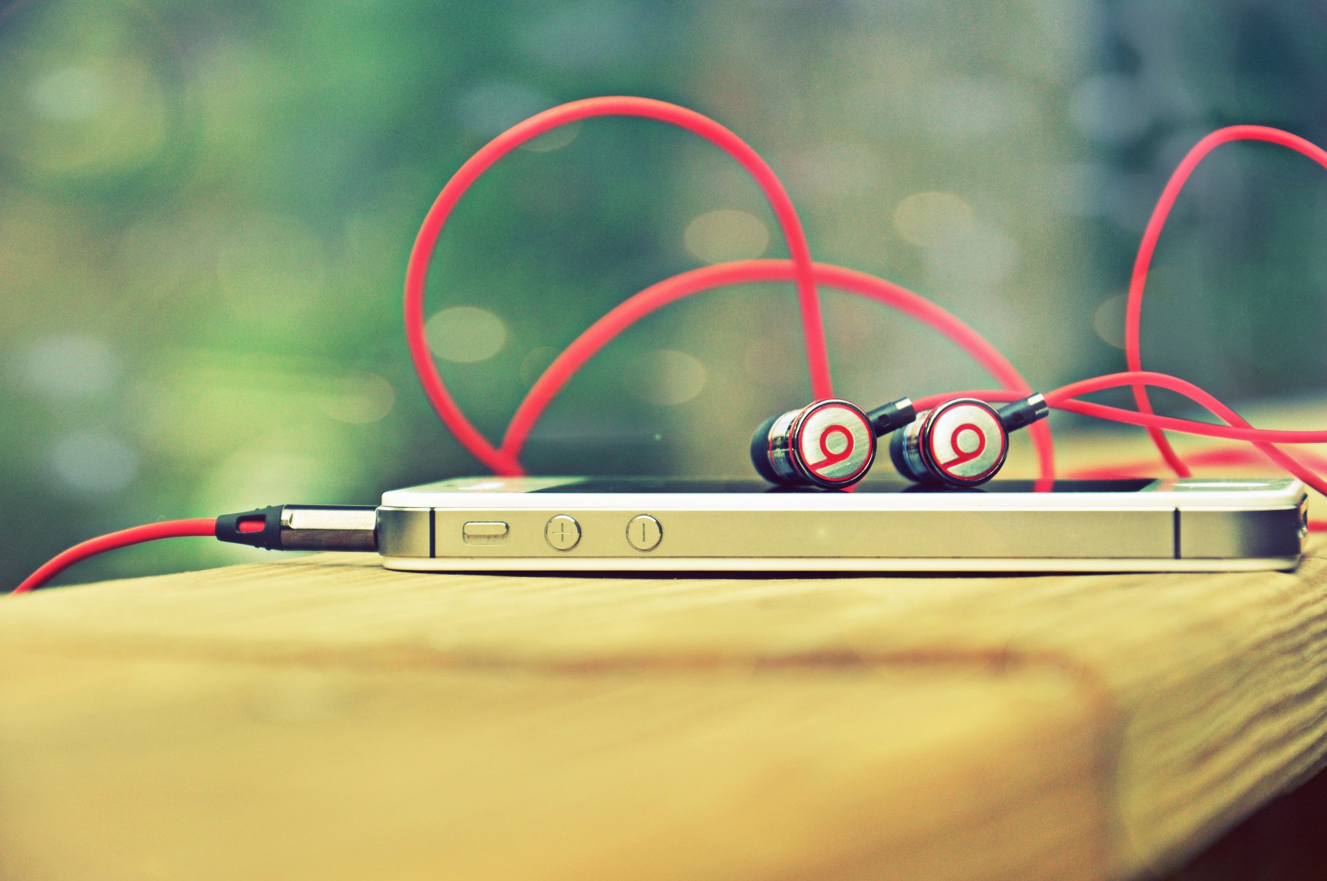 IPhone avec des écouteurs beats repose sur une surface en bois
