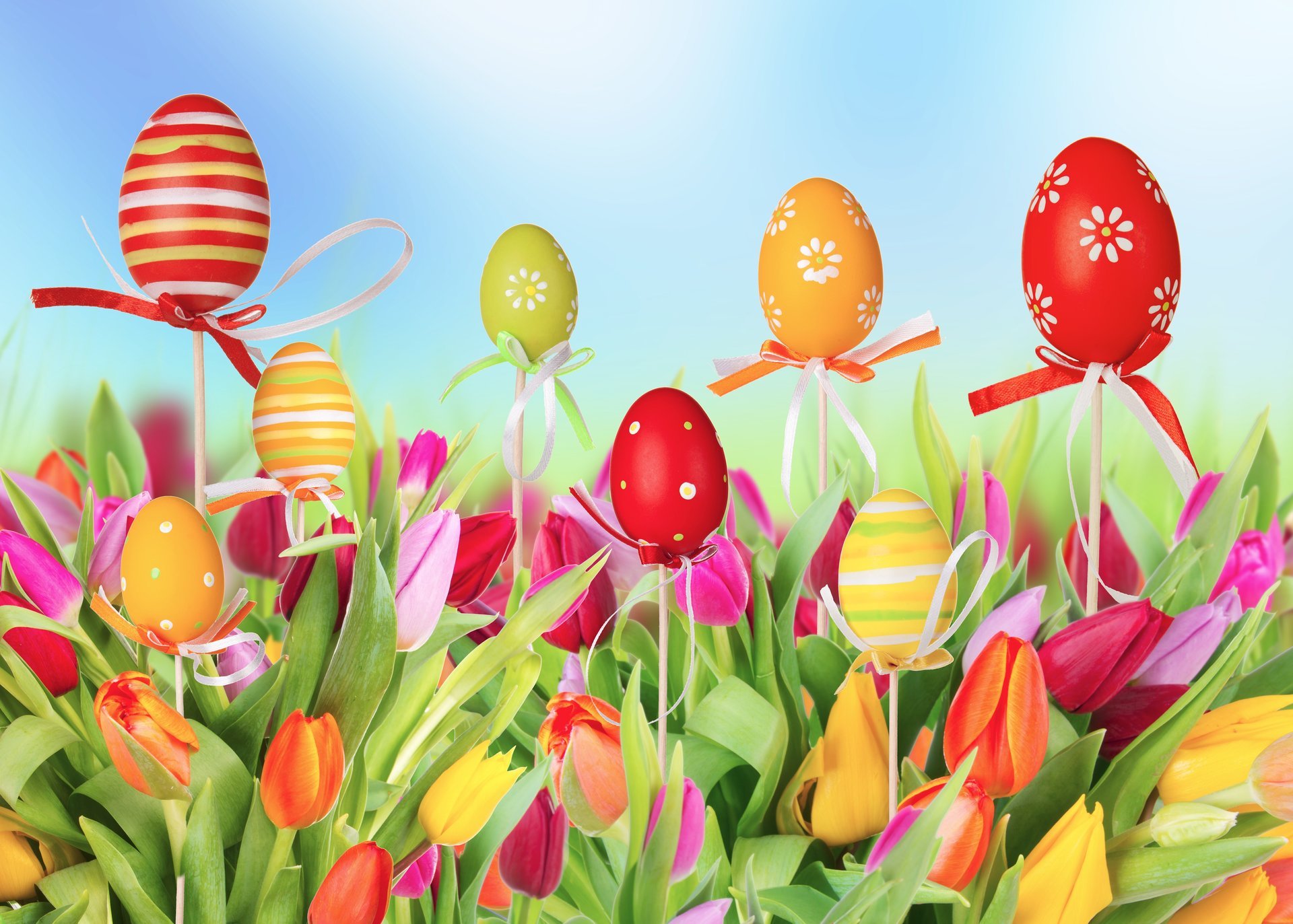 Oeufs de Pâques avec des gâteaux et des fleurs