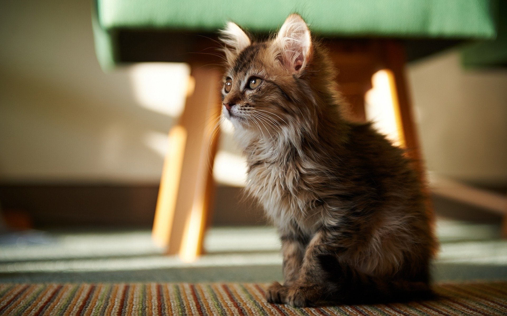 Chaton est assis sur le sol près d'un tabouret et regarde au loin