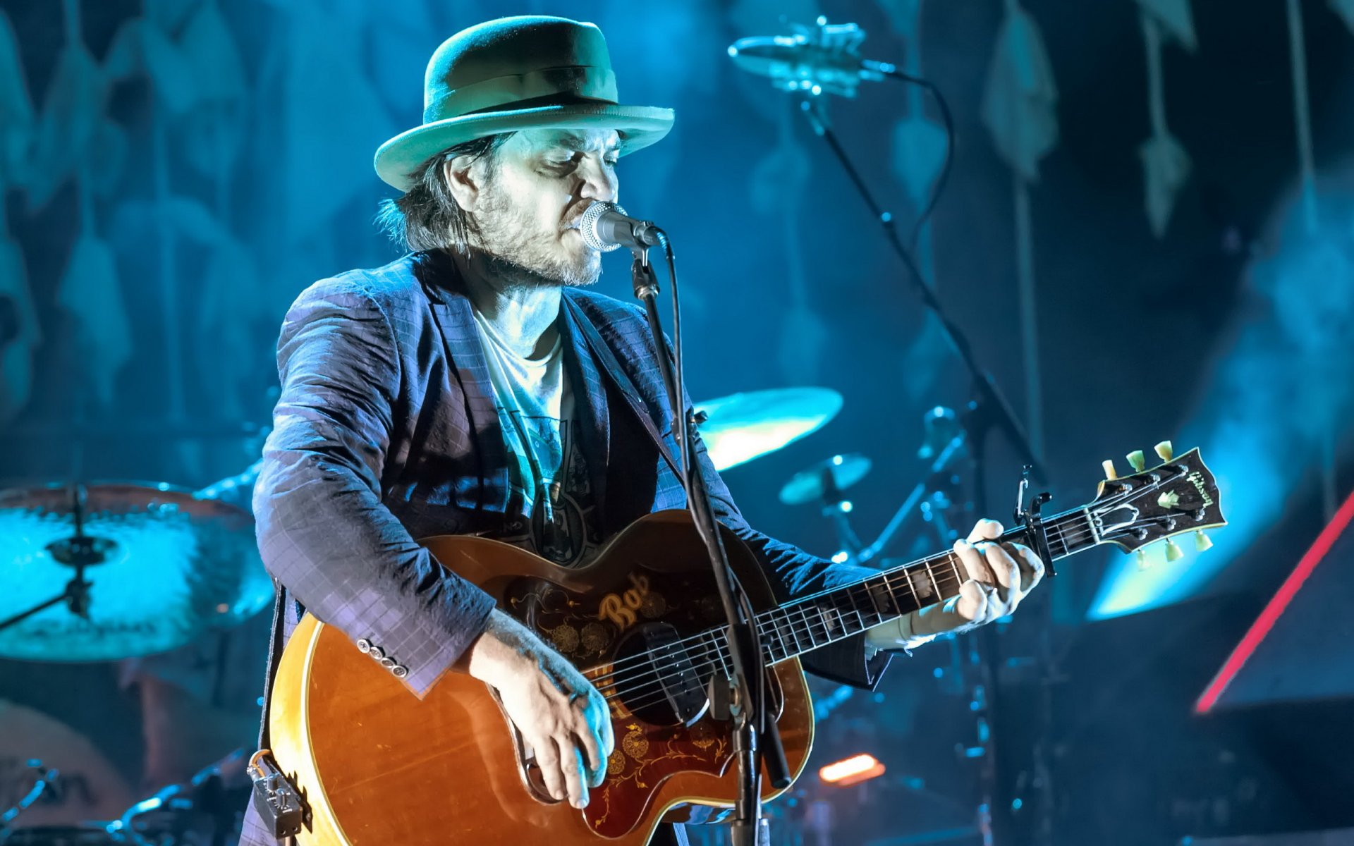 Musicien dans un chapeau avec une guitare chante lors d'un concertMusicien dans un chapeau avec une guitare chante lors d'un concert