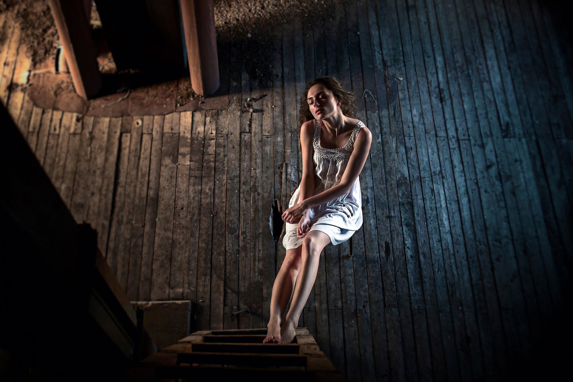 Une jeune femme est assise sur une chaise, mettre les pieds sur l'escalier