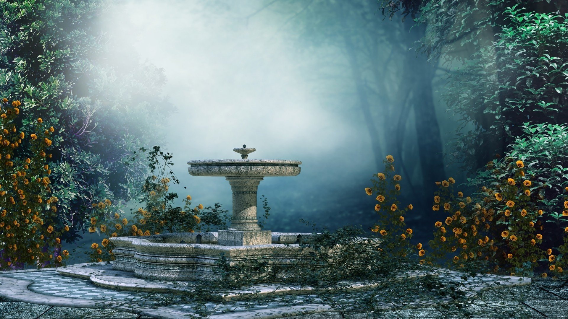 Fontaine dans le silence de la forêt et le parfum des fleurs