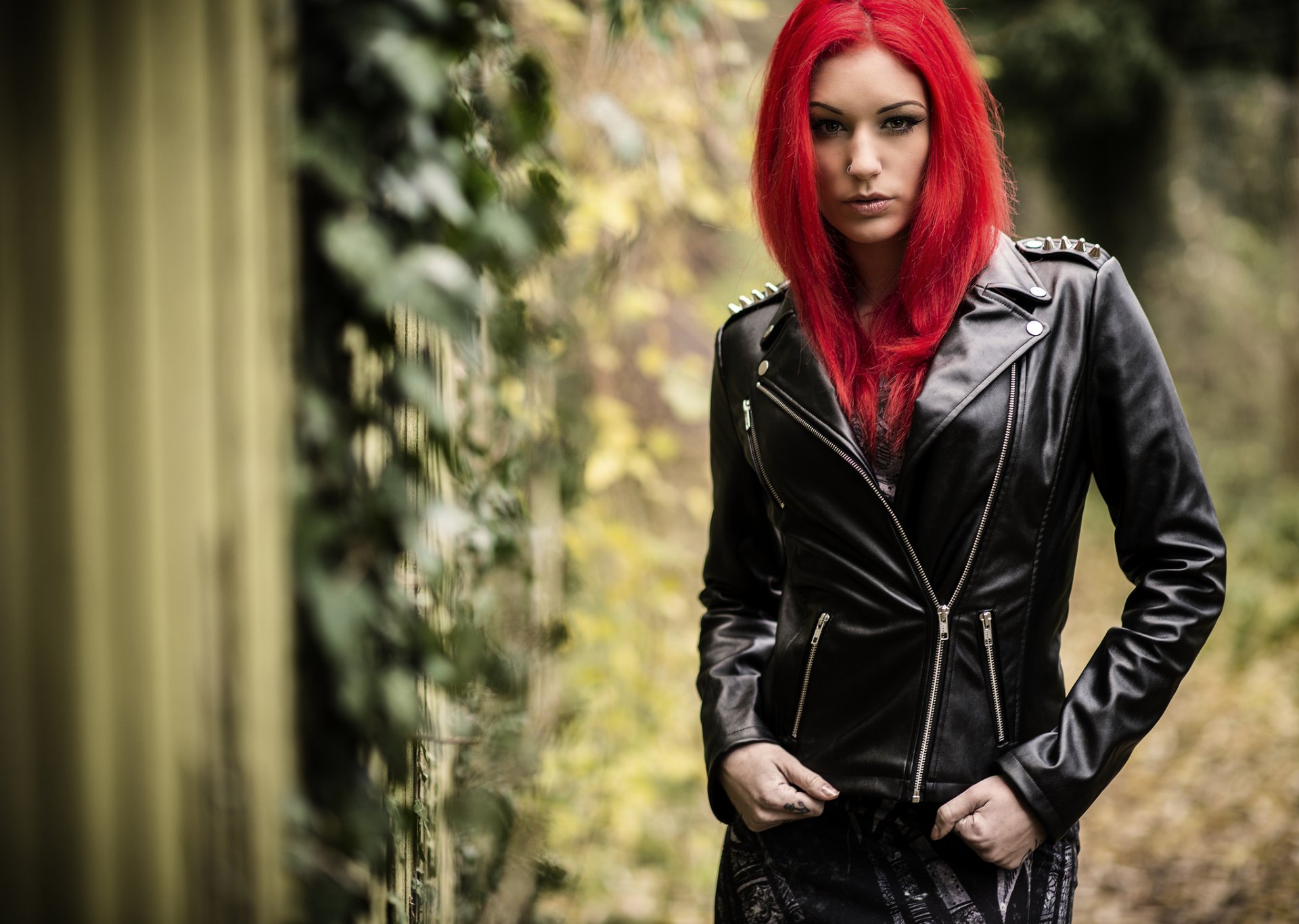 Mec chaud dans une veste en cuir et des gants avec un miroir dans les mains