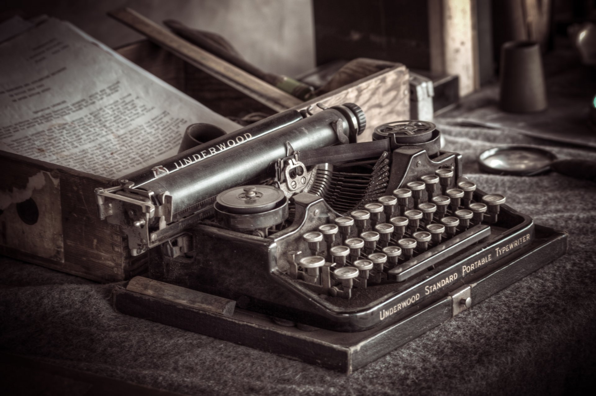 Vieille machine à écrire de rareté avec horloge sur fond d'escalier