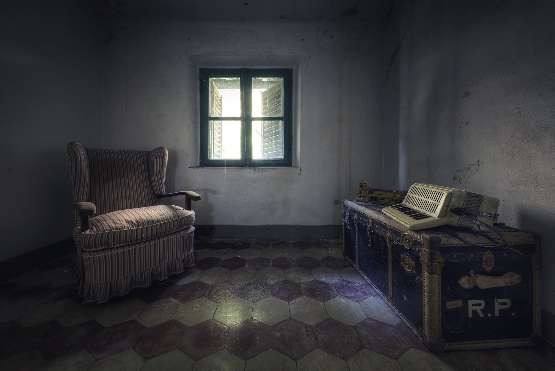 Ruines d'un vieux château dans un champ et au-dessus d'un ciel orageux