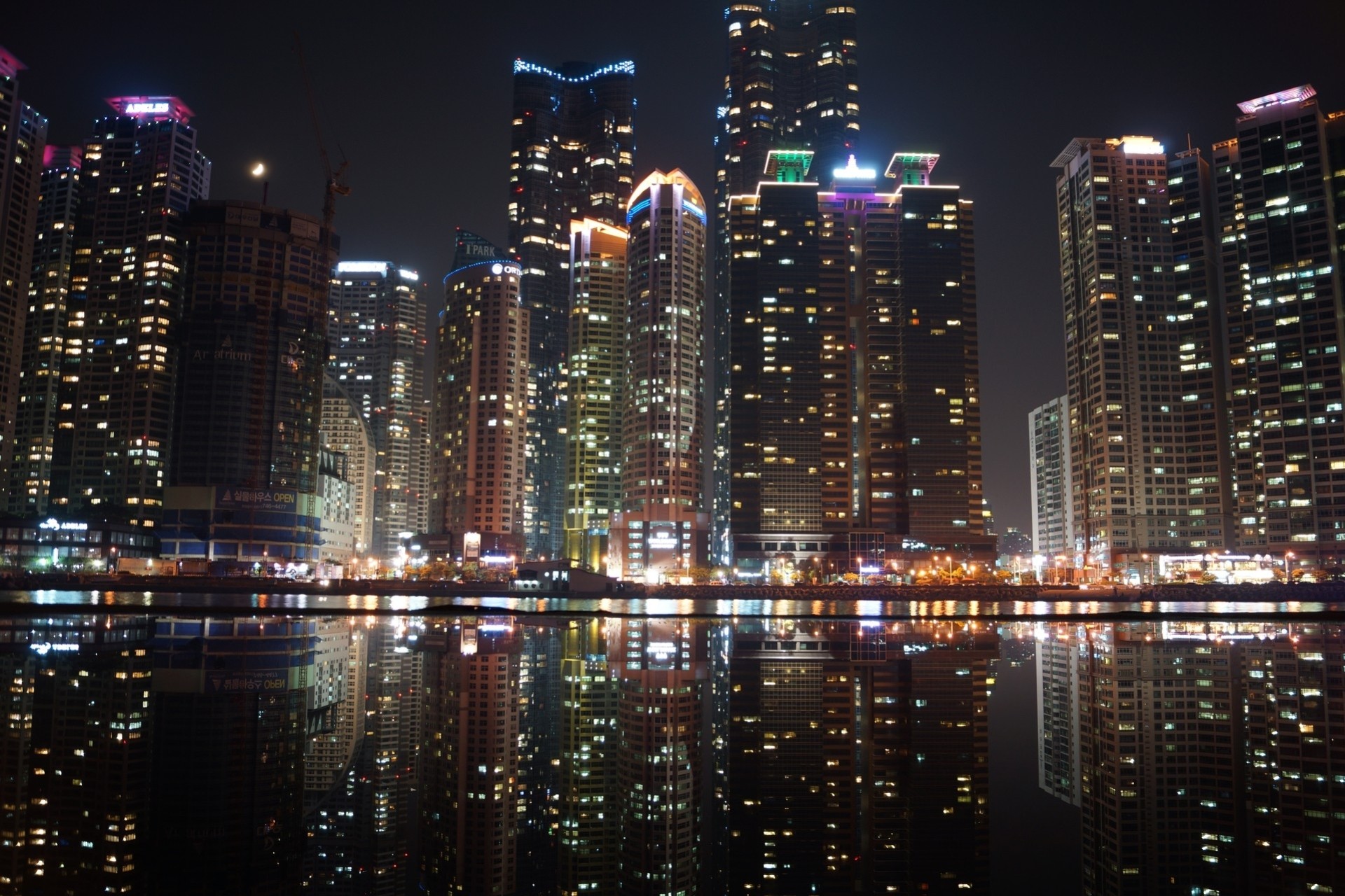 Ville de nuit, les lumières des gratte-ciel s'allument