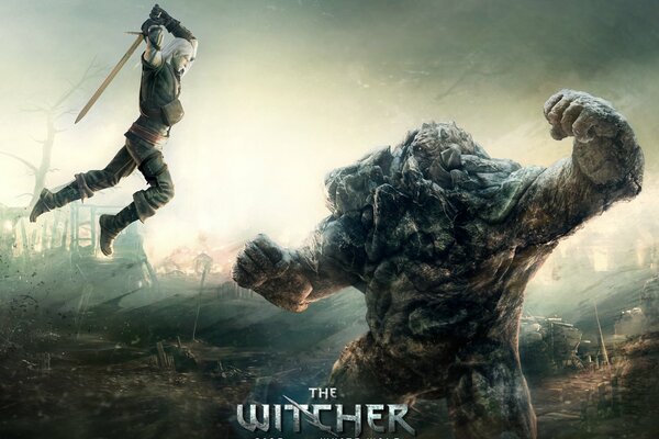Le sorceleur dans le saut à l'épée contre le golemLe Sorceleur dans le saut à l'épée contre le Golem