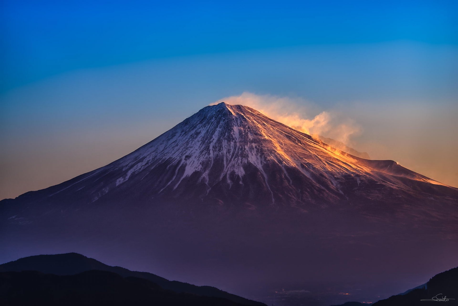 Fumée de volcan dans les montagnes sur fond de nuages