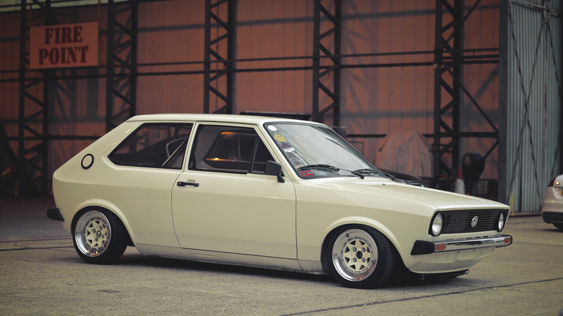 Volkswagen blanc se trouve dans le garage sur fond de graffiti