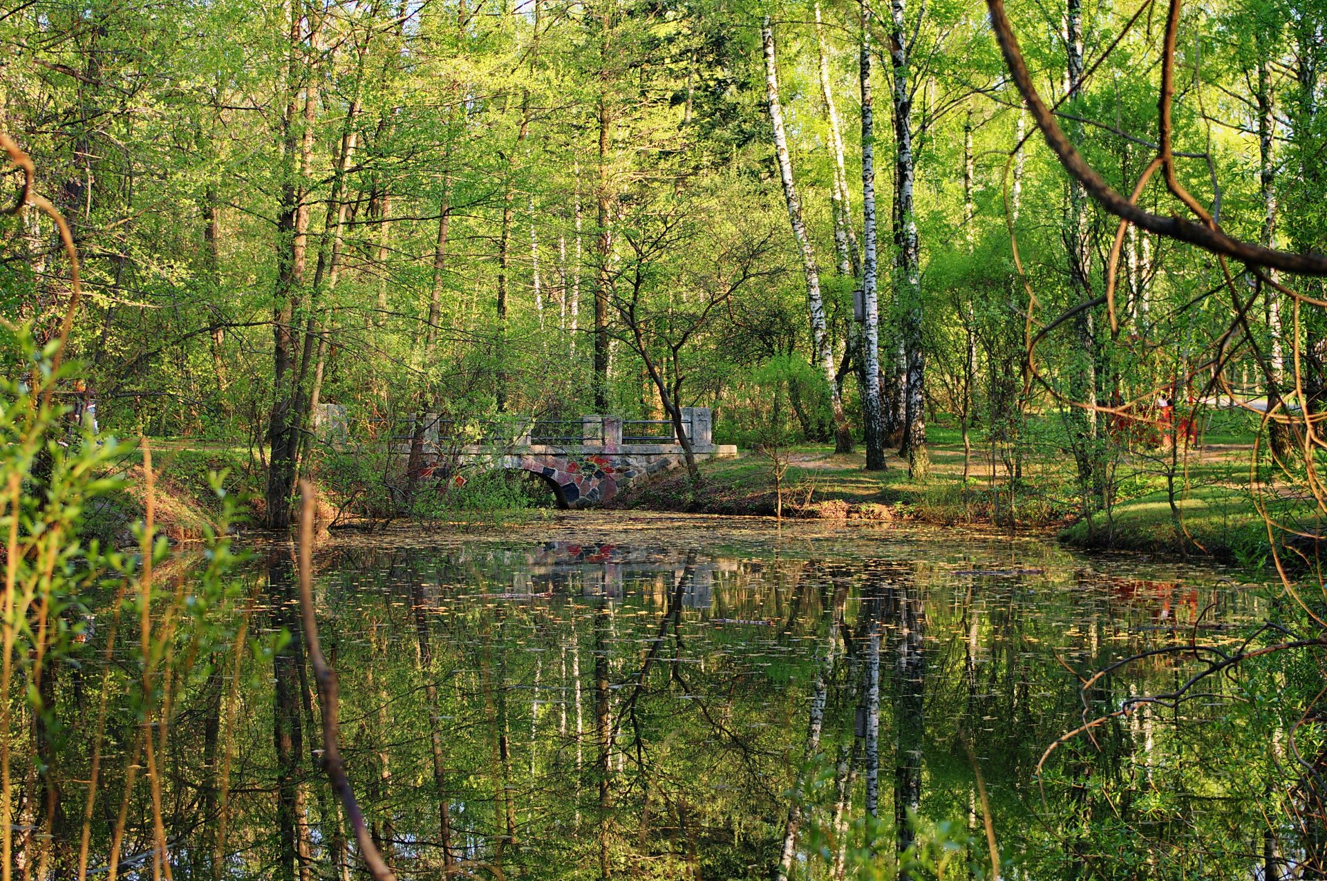 Parc dans les lumières dans le reflet de l'étang